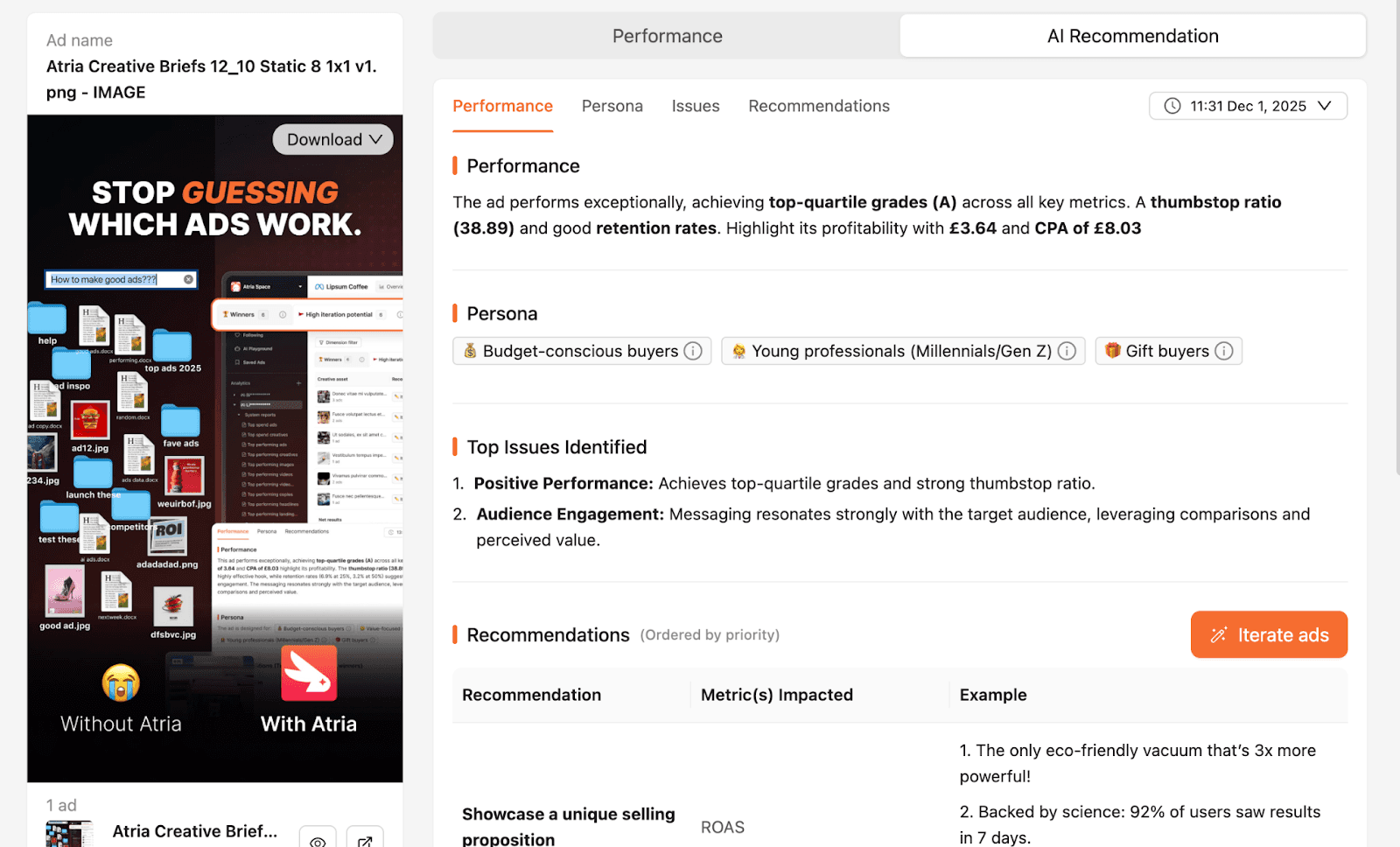 Once you have your recommendations, you don't need to jump to another tool to implement them. Atria includes an “Iterate” button that generates new creative variants based on the AI's recommendations.