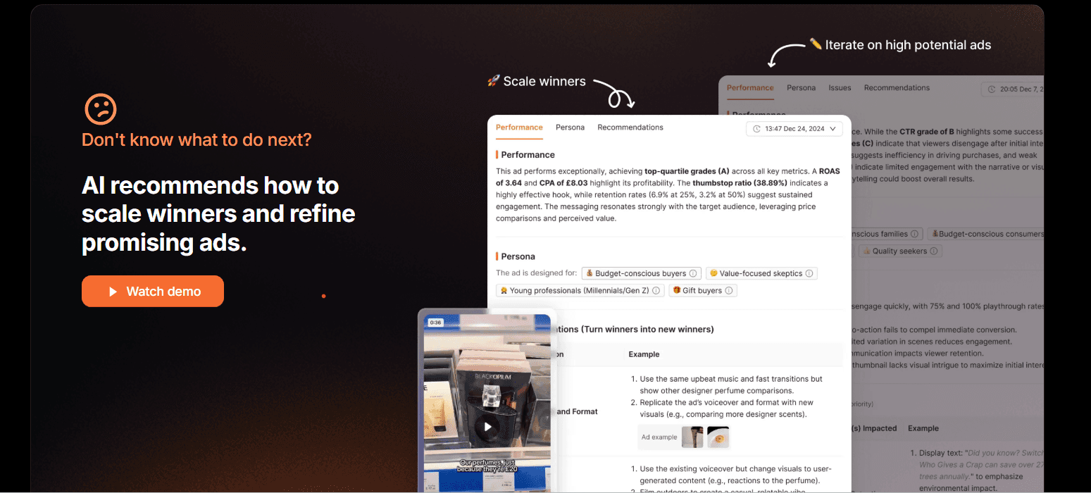 Most analytics tools point out the problem. They show you which ads are losing, highlight the metrics, and organize everything into dashboards. But when it's time to fix the underperformer, you're left wondering where to start. Swap the hook? Change the first three seconds? Try a different offer?