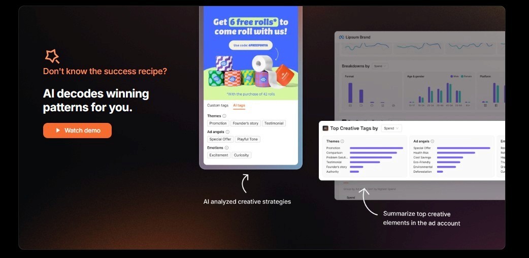 Maybe all your best-performing ads use comparison angles. Or perhaps your winning hooks all start with a question. These patterns might not be obvious when you're looking at individual ad metrics, but when AI analyzes thousands of data points across your portfolio, they become clear.