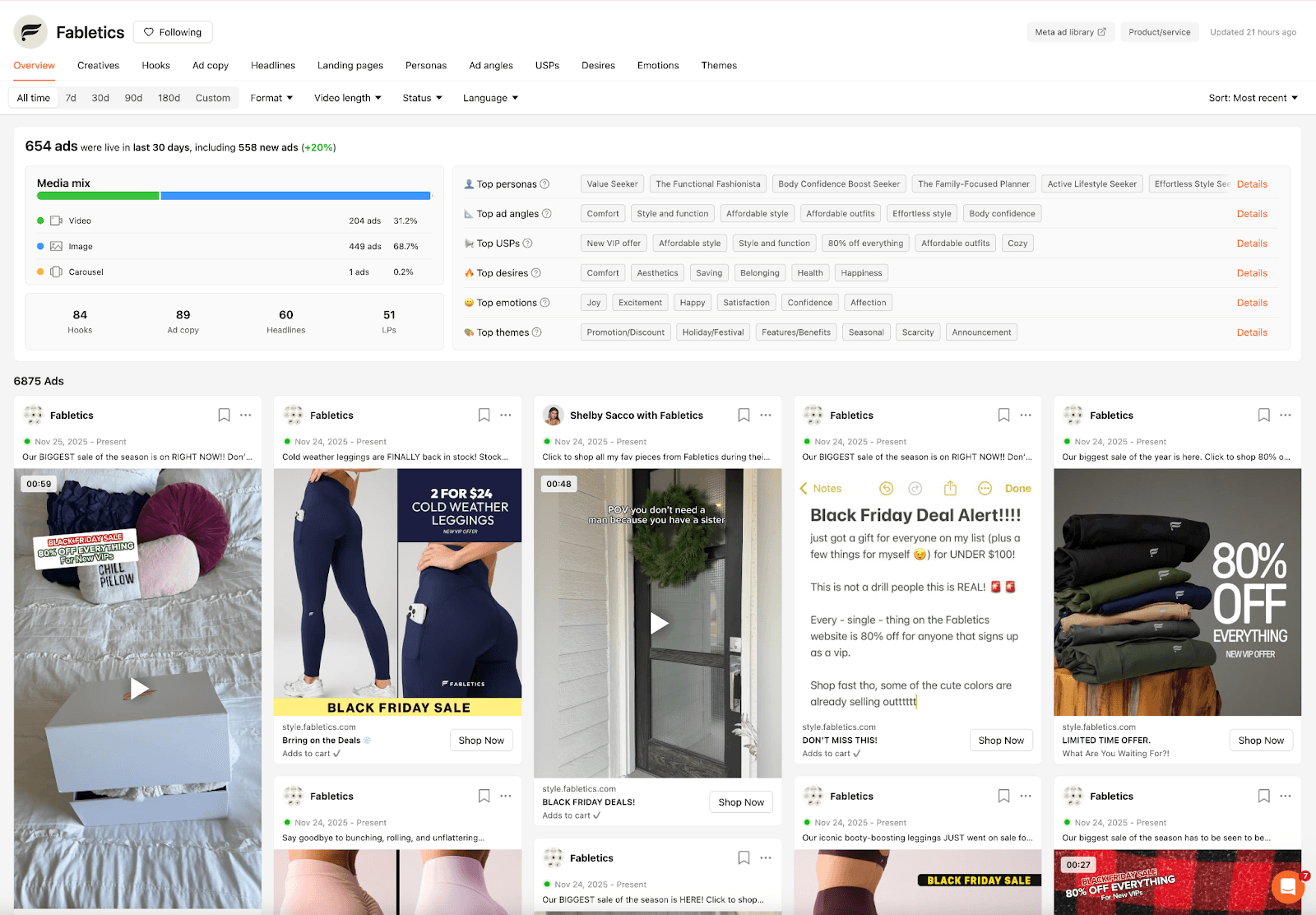 The creative strategy behind the ads. What hooks are they testing? Are they leading with problem-awareness or jumping straight to the solution? What emotional triggers are they using?