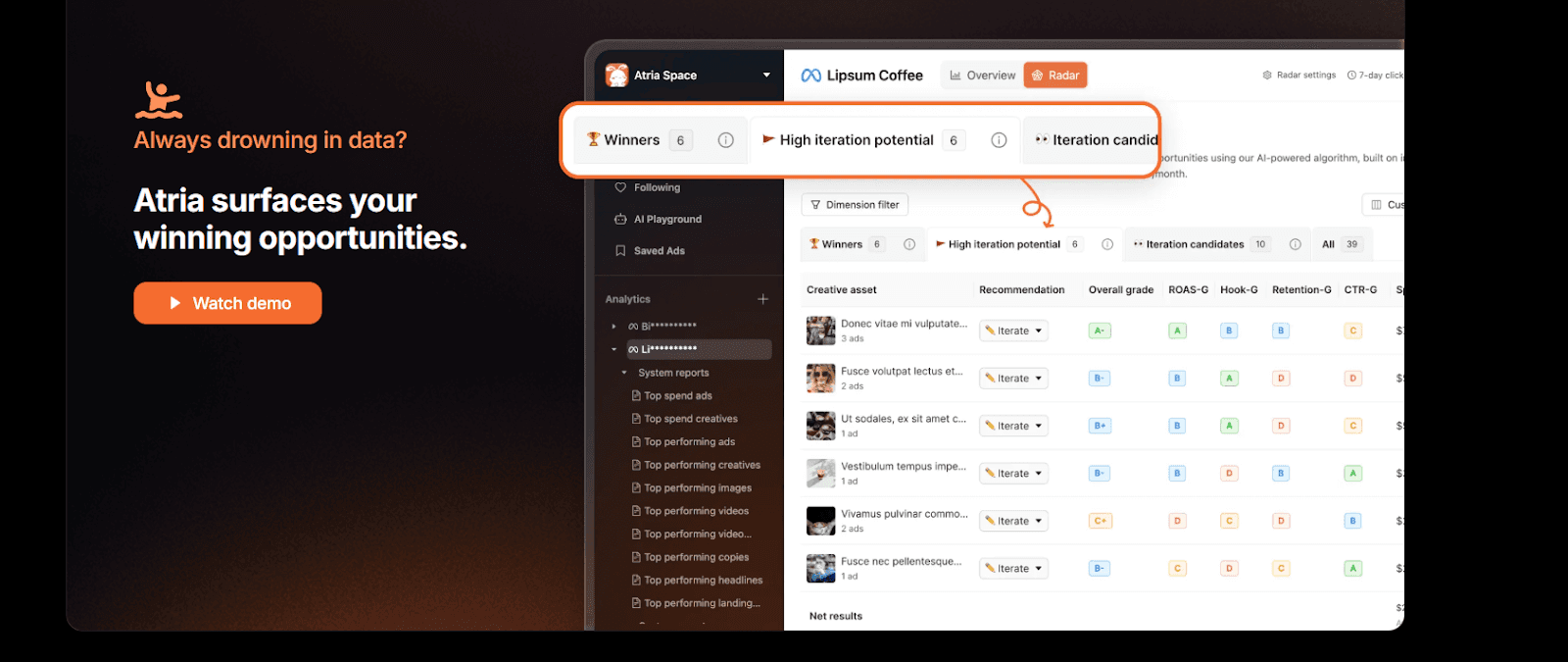 Atria solves this. Instead of spending hours hunting through Meta's ad library, you get instant access to millions of ads with smart filtering by industry, performance indicators, and creative elements. Track your top competitors automatically and identify when they launch new campaigns or shift strategies.