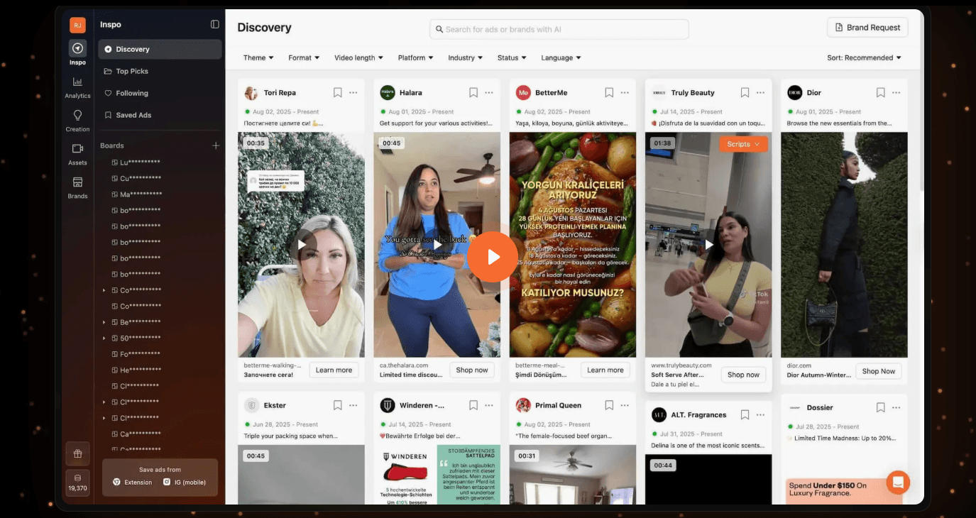 Filter by your industry to see what the entire category is doing. You might discover that 80% of beauty brands are using dermatologist endorsements right now, or that ingredient-focused ads are outperforming before-and-after shots. This gives you the market context before you zoom in on individual brands.