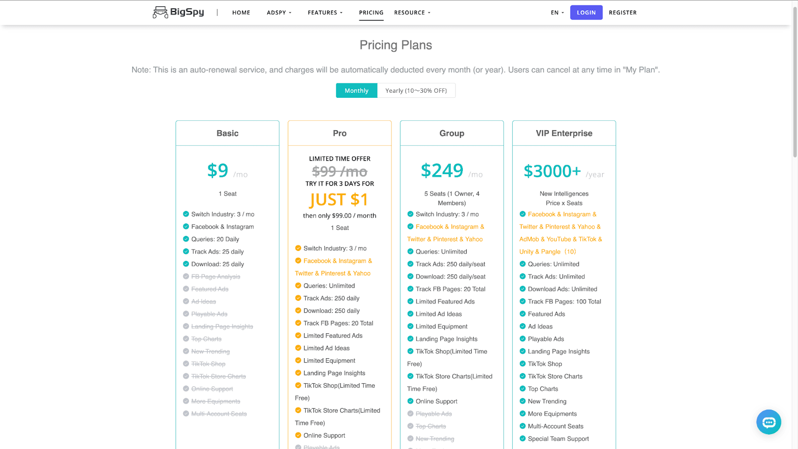 BigSpy’s pricing starts at $9/month for a single-seat plan with very strict usage limits and goes up to $3,000+ a year for their VIP Enterprise plan with unlimited queries, tracking, downloads and full feature access.