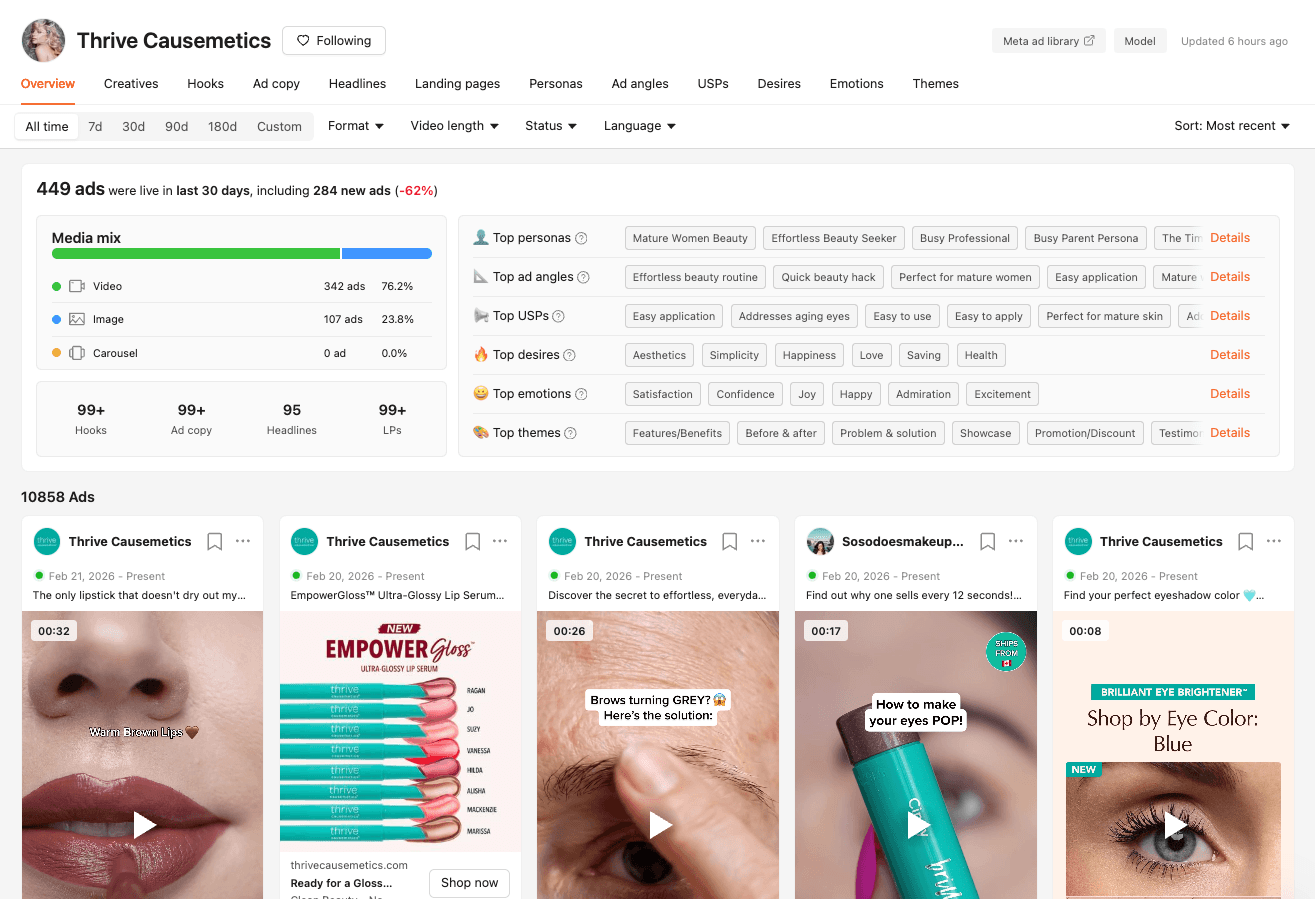She digs into competitor creatives to show you their top hooks, landing pages and target personas