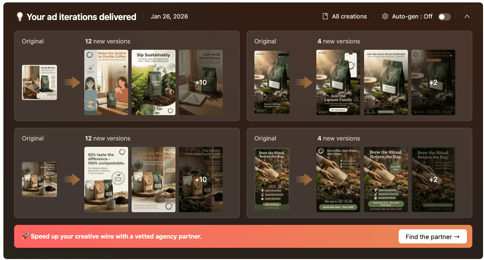 If you’re reading this, you probably don’t need us to tell you that performance marketing has a creative volume problem. Meta’s algorithm is insatiable. It needs more creatives than any human team can reasonably produce, and the math only gets worse as you scale. More spend means more creatives means more hours means… what, exactly? Another hire you can’t justify? Another late night stitching together reports across five tabs?